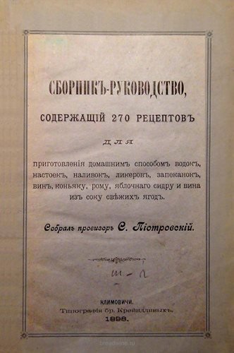 Полное название: Сборник-руководство, содержащий 270 рецептов приготовления домашним способом водок, настоек, наливок, ликеров, запеканок, вин, коньяка, рома, яблочного сидра и вина из сока свежих ягод.