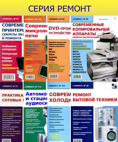 "Ремонт"- это книги предназначенные для специалистов и подготовленных пользователей, обслуживающих бытовую и оргтехнику. Все, что вы хотели узнать о ремонте простой и сложной бытовой электронной техники и промышленной аппаратуры. Нужные схемы и описания принципов работы, методики поиска и устранения неисправностей. Книги, альбомы и справочники по ремонтной тематике для всех.Список книг